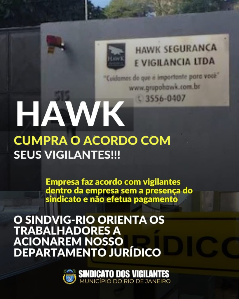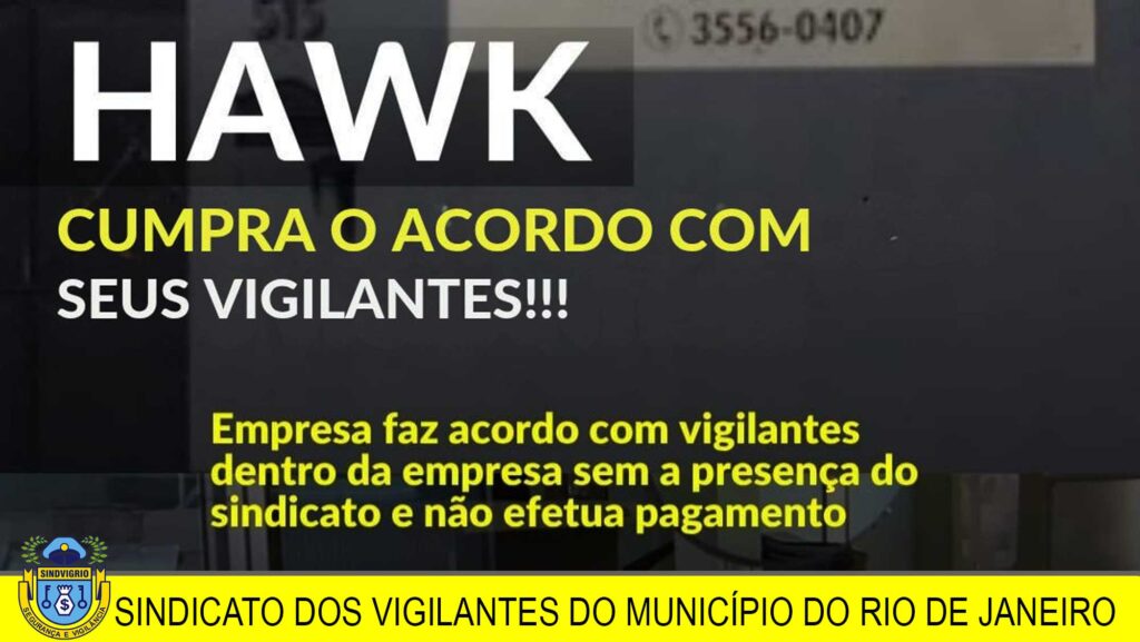 O SINDVIG.RIO, vem recebendo denúncias de vigilantes da empresa HAWK, que fizeram acordo na empresa sem a presença deste sindicato e a empresa, não está cumprindo com o pagamento.