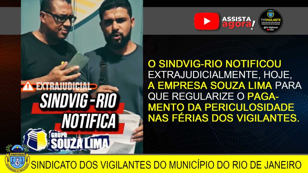 O Sindvig-Rio notificou extrajudicialmente, hoje, a empresa Souza Lima para que regularize o pagamento da periculosidade nas férias dos vigilantes.