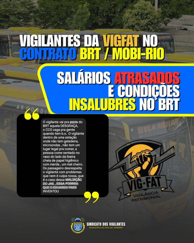Os vigilantes da VigFat no contrato BRT – MOBI-Rio convivem com atrasos constantes no pagamento de salários e do vale alimentação.